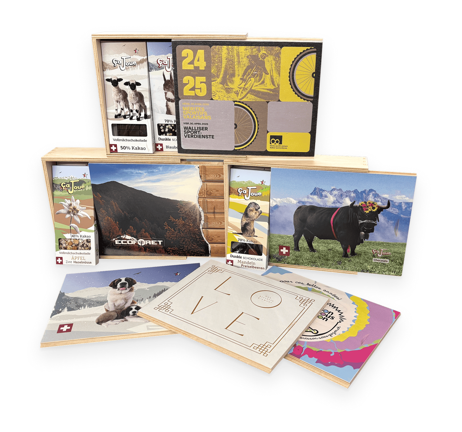 Geschenkboxen aus Holz mit Ihrem individuellen Deckel und 6 oder 9 Pralinen Ihrer Wahl.