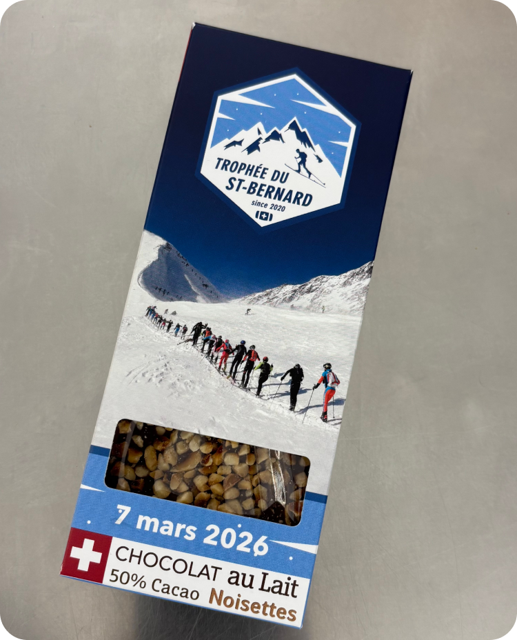 Nous sommes honorés d’une collaboration avec la 4ᵉ édition du Trophée du Saint-Bernard et un chocolat au lait 50% Cacao et Noisettes.